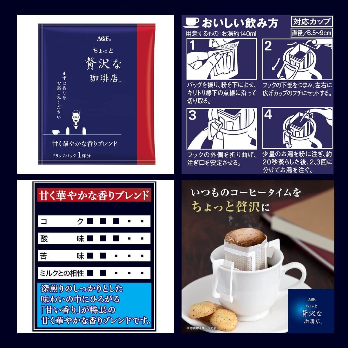 AGF(エージーエフ) 「ちょっと贅沢な珈琲店」 レギュラー・コーヒー ドリップパック 甘く華やかな香りブレンド100袋は、深煎りのしっかりとした味わいの中にひろがる「甘い香り」が特長の、甘く華やかな香りのブレンドです。オフィスや沢山消費される方に最適なお徳用サイズです。1杯1杯がいつも新鮮な個包装タイプ。