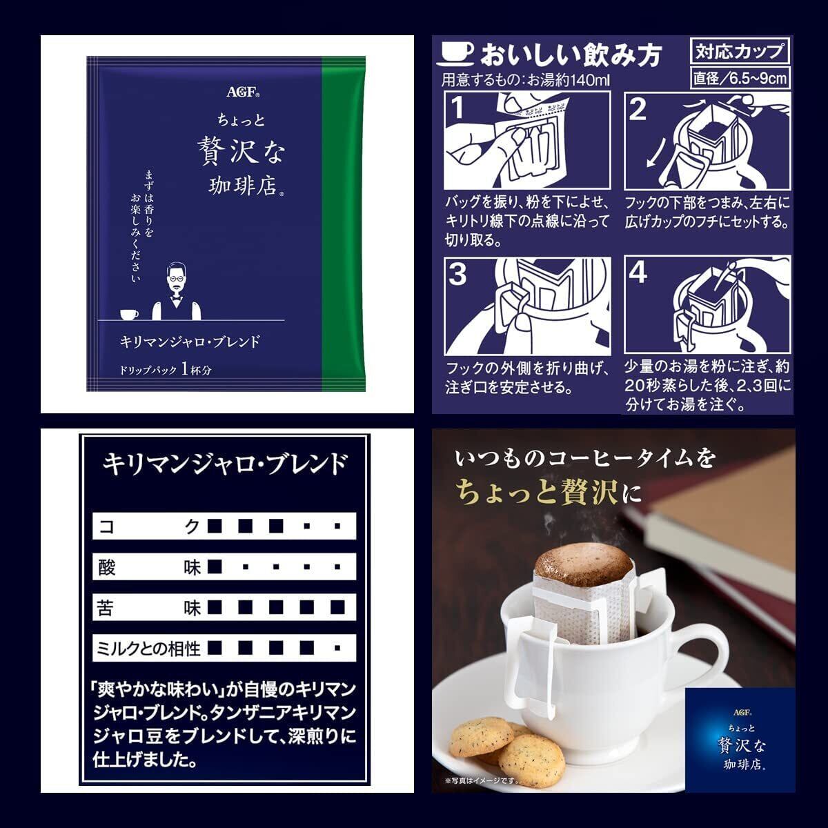 AGF(エージーエフ) 「ちょっと贅沢な珈琲店」 レギュラーコーヒー ドリップパック キリマンジャロブレンド100袋は、タンザニアキリマンジャロ豆をブレンドして、深煎りに仕上げました。「爽やかな味わい」が自慢です。オフィスやご自宅でたくさん消費される方に最適なドリップコーヒーのお得な大容量サイズです。1杯1杯がいつも新鮮な個包装タイプ。